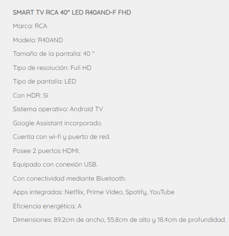 El LED Smart TV RCA 40" R40AND combina funcionalidad y entretenimiento en un diseño moderno y compacto. Su pantalla Full HD de 40 pulgadas con tecnología LED y soporte para HDR ofrece imágenes nítidas, colores vibrantes y un rango dinámico mejorado, ideal para disfrutar de tus contenidos favoritos con calidad excepcional.